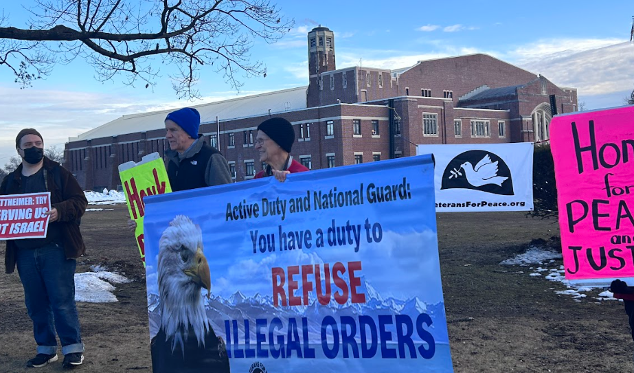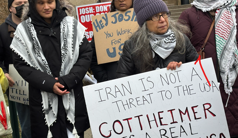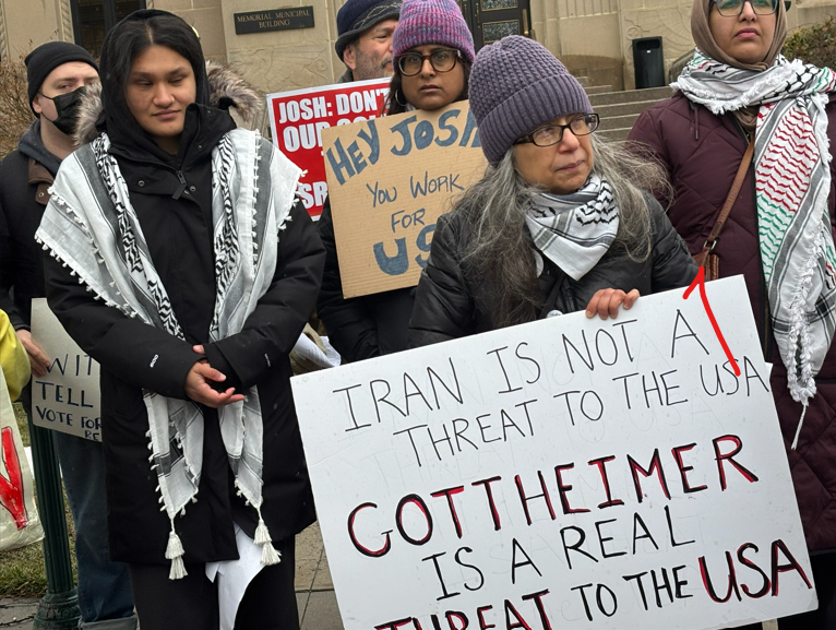 In Fort Lee, about 17 protesters chanted, “Gottheimer don’t you understand? We don’t want a war with Iran!”, “We don’t want another Iraq! But Josh doesn’t care ’cause he’s bribed by AIPAC!” and “Josh, there’s only one solution! Vote for the War Powers Resolution!” and held signs with messages including “No War with Iran! Tell Josh to Vote for Khanna/Massie Resolution!”, “Gottheimer: Try Serving Us Not Israel”, and “Iran Is Not a Threat to the USA – Gottheimer is a Real Threat to the USA.” Protesters also distributed leaflets and collected petition signatures, though foot traffic was limited by the harsh weather conditions including hail. After the demonstration, protesters, who were mostly Gottheimer constituents, lined the halls of the Fort Lee Municipal Building, protest signs in hand, to individually register their complaint and demand with the Congressman’s representative. In Englewood, a smaller group passed out leaflets at the busy intersection of North Van Brundt Street and Palisade Avenue before joining the Teaneck vigil, where 16 demonstrators held signs and banners and leafletted passengers leaving buses. .