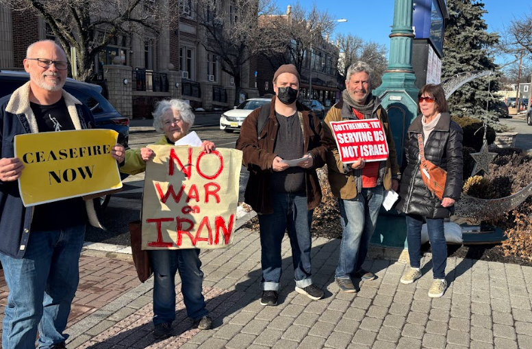 Fort Lee/Englewood/Teaneck, NJ – On Tuesday, March 3 at 10 AM at the Fort Lee Municipal Building at, 309 Main St and today, Wednesday, March 4, at 2 PM at Englewood Town Hall at 2-10 N Van Brunt Street, both sites where Congressman Josh Gottheimer holds weekly office hours and at the Teaneck Peace and Justice Vigil at 4 PM at the Teaneck Armory at 1799 Teaneck Road, opponents of the US/Israel bombing of Iran demonstrated to express outrage at Gottheimer’s public opposition to the Khanna/Massie War Powers Resolution and his support for Trump’s bombing of Iran.