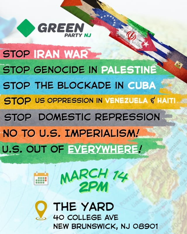 The Green Party of New Jersey is organizing the “Rally of Peace” and welcomes everyone to attend and participate as endorsers and/or speakers to call out the oppression and aggressions committed by United States against the world. The current situation in Iran poses significant risks for the entire world. When we allow our government to bomb and invade countries without facing the repercussions we reinforce a troubling precedent, AGAIN, that we can manipulate global affairs and pursue the empire we’ve always claimed to be. We are instead solidifying our image as a ‘warmonger’ for generations to come, setting ourselves up as the main enemy while causing substantial harm to entire populations and on the environment. This occurs through the complacency of both parties, motivated primarily by profit at the expense of human beings. We need to unify our efforts and continue advocating for peace every opportunity we have because that would be our legacy to our children.