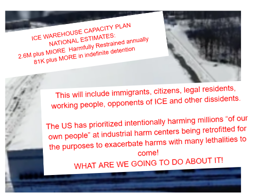 The ICE harm capacity increases show this crackdown not only about immigrants – the US is intending a permanent state of harming millions of Americans in the streets, at industrial harm centers – on top of all the other forms of social mass murder occurring at ever accelerating rates with the degradations of across the board of services, due to climate disaster, ecological destruction, lack of health care, dismantling of regulations and enforcement and undermining of anything and everything intended to improve the lives of our people,