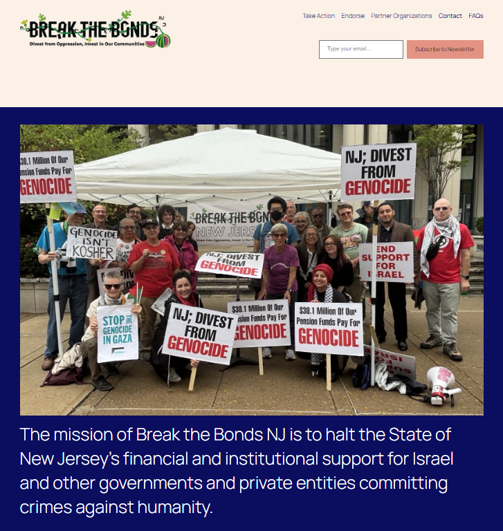 Break the Bonds NJ invites all New Jerseyans to call upon state officials for divestment and more ethical state investment practices. Those interested can get involved at https://breakthebondsnj.org/