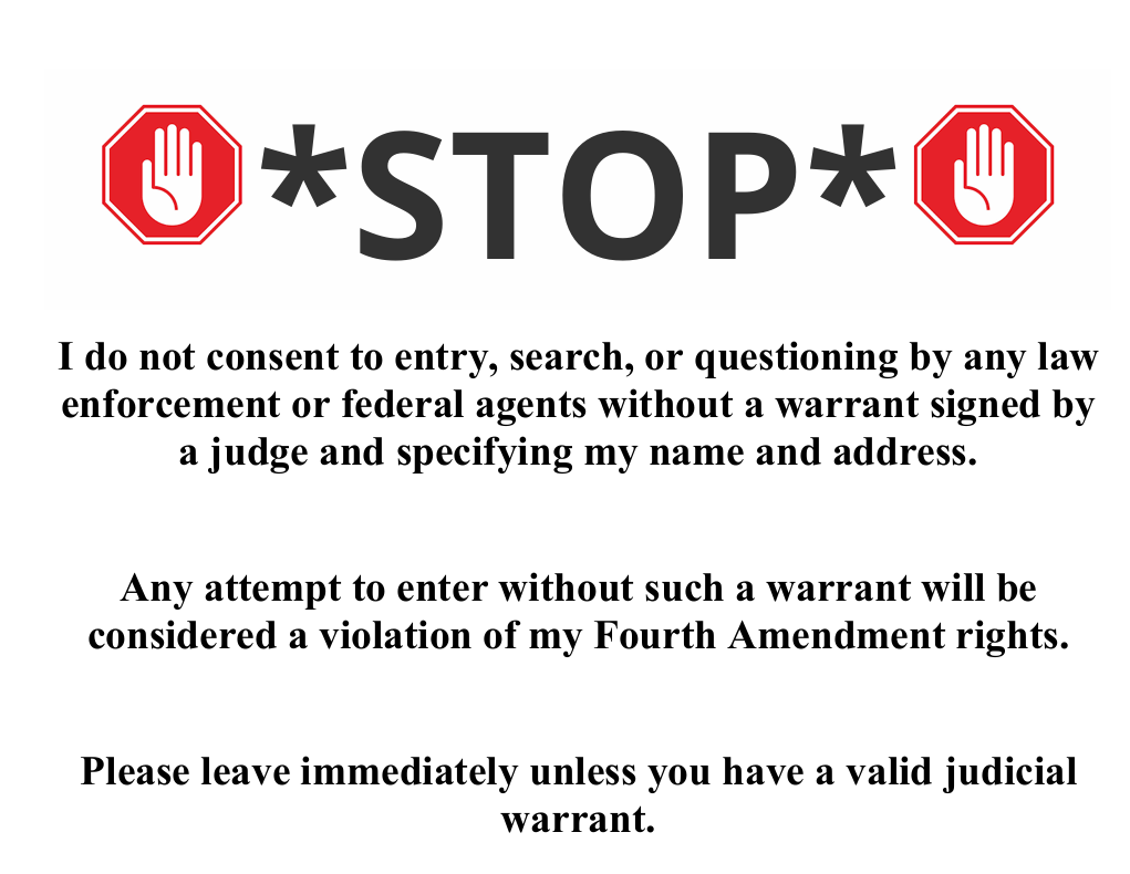 Now that the Trump Admiinstration has unleashed ICE from the tethers of the Fourth Amendment – see articles linked today – folks need to get some signs up on their homes nd businesses.
