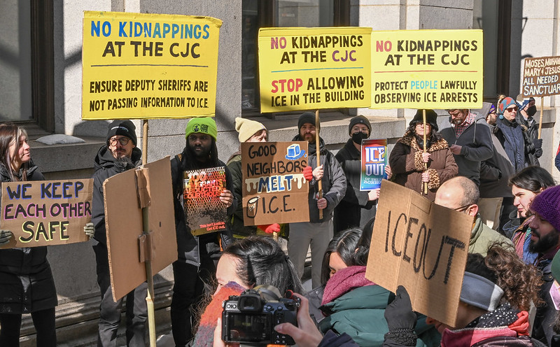 The petition, drafted by No ICE Philly and signed by more than 5,400 Philadelphians, calls on Sheriff Bilal to “end ICE’s campaign of terror at the courthouse.” The petition delivery comes one day after No ICE Philly and other immigrant justice organizations (including Juntos, Asian Americans United, and ACLU PA) met with Sheriff Bilal to present suggestions to keep people safe at the CJC. The sheriff did not commit to making any changes but agreed to explore options to prohibit ICE from wearing masks inside the courthouse and loitering in the courthouse lobby.
