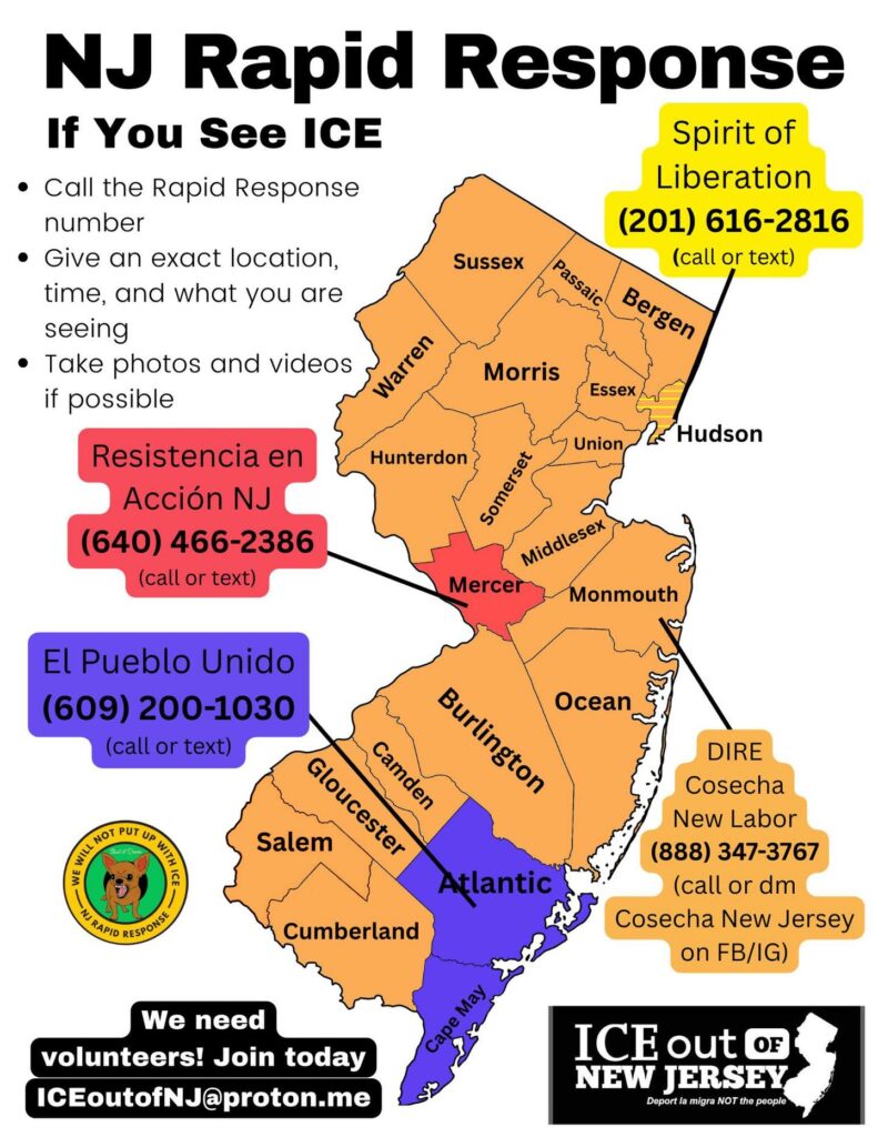 Above is a widely circulated “Rapid Response Network” map for NJ to attempt to mobilize support for working people and families coming under ICE repression in NJ. Text has been added with links to the organizers of the network and links directly to the phone numbers for quick click phone connections.