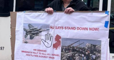 That belief was reinforced and you can watch a clip of a rally of pro-Israel NJ leaders – I made reference to this at the meeting. “There is no innocent in Gaza, terrorists from cradle to grave” as they conduct slaughter taking babies from cradle to grave. Notice also the Trump flag carried by the one calling for deportation of anyone who disagrees with his venom. Notice – no Biden flags among the Israel supporters – and the Proud Boys – and the planes they had flying over our protest doing mock bombings of us as if they want to slaughter us here if we disagree with their narrative. That was their fantasy on May 19 in Jackson Township NJ.