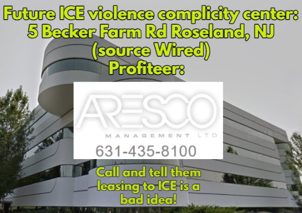 For now this editor suggests opponents of the ICE terror regime can call Aresco’s main number and ask to talk to Craig Padover or a community relations spokesperson and urge them to reject profiting from violence and terror and to reject the ICE leasing of the Roseland office space to ICE: