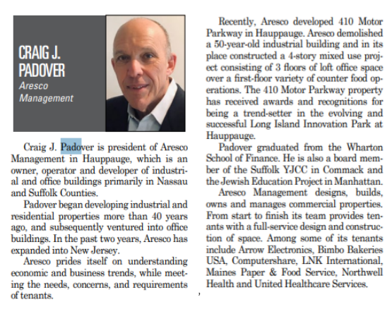 Aresco’s president is Craig Padover and he is described in this 2023 Long Island Who’s Who in Business report.