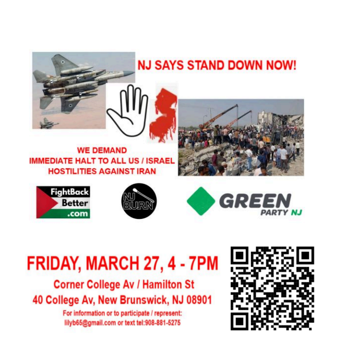 The Green Party of New Jersey together with NJ BURN (Build Up Resistance Now) and FightbackBetter are organizing a protest against US wars abroad including on Iran and US domestic terror against the US civilian population and welcomes everyone to attend and participate as endorsers and/or speakers to call out the oppression and aggressions committed by United States against the world.