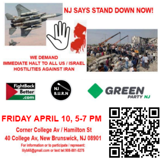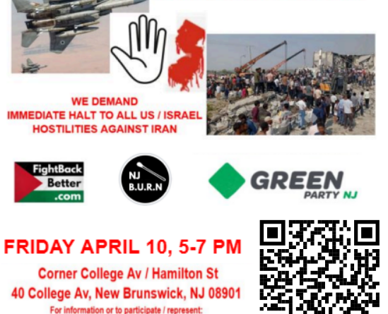 The Green Party of New Jersey together with NJ BURN (Build Up Resistance Now) and FightbackBetter are organizing a second protest at the edge of the Rutgers College Avenue New Brunswick campus against US wars abroad including on Iran and US domestic terror against the US civilian population. We welcome everyone to attend and participate as endorsers and/or speakers to call out the oppression and aggressions committed by United States against the world.