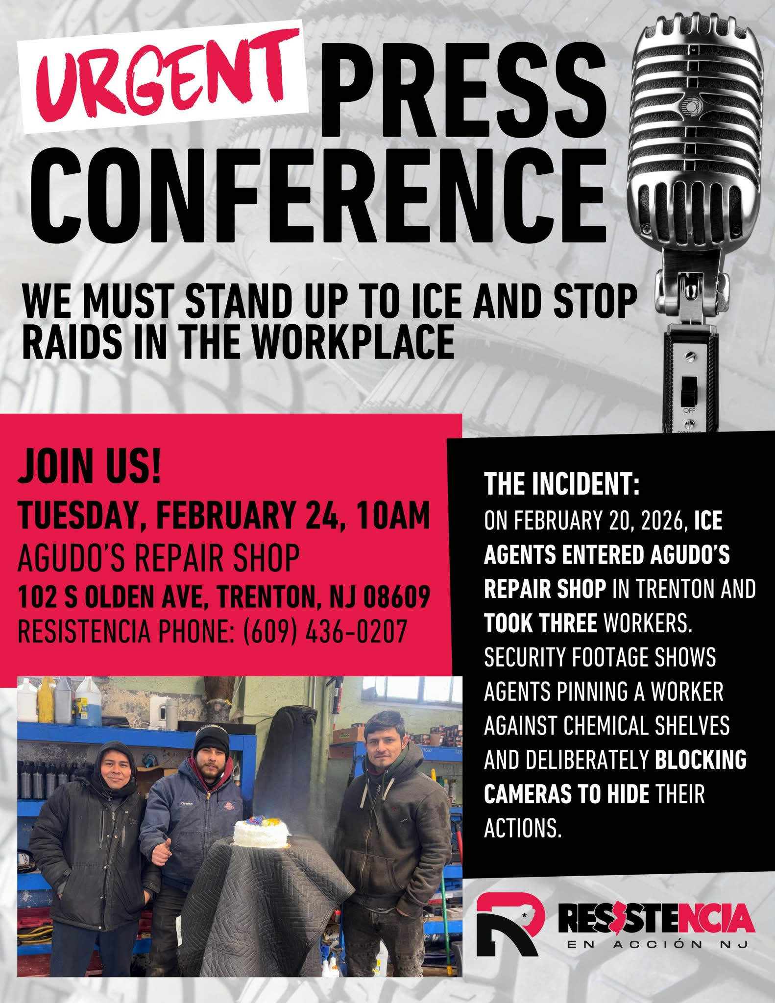 Please attend the press conference Tuesday, February 24, 10 am, Agudo’s Repair Shop. 102 S. Olden Av., Trenton NJ 08409